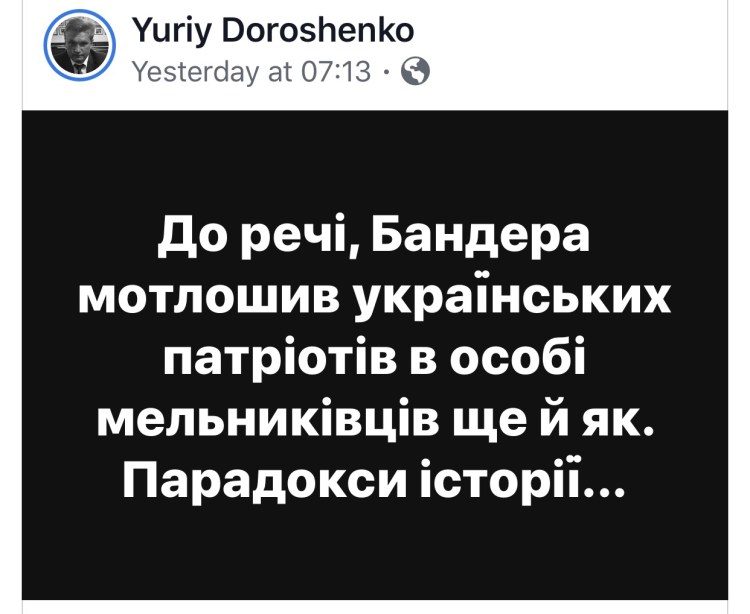 Юрій Дорошенко (Yuriy Doroshenko) спровокував дискусію про Степана Бандеру й бандерівців у їхніх стосунках з мельниківцями. Volodymyr Viatrovych (Володимир В’ятрович) став на захист свого кумира (див.: https://www.facebook.com/100000100524358/posts/2514772535202739?sfns=mo).