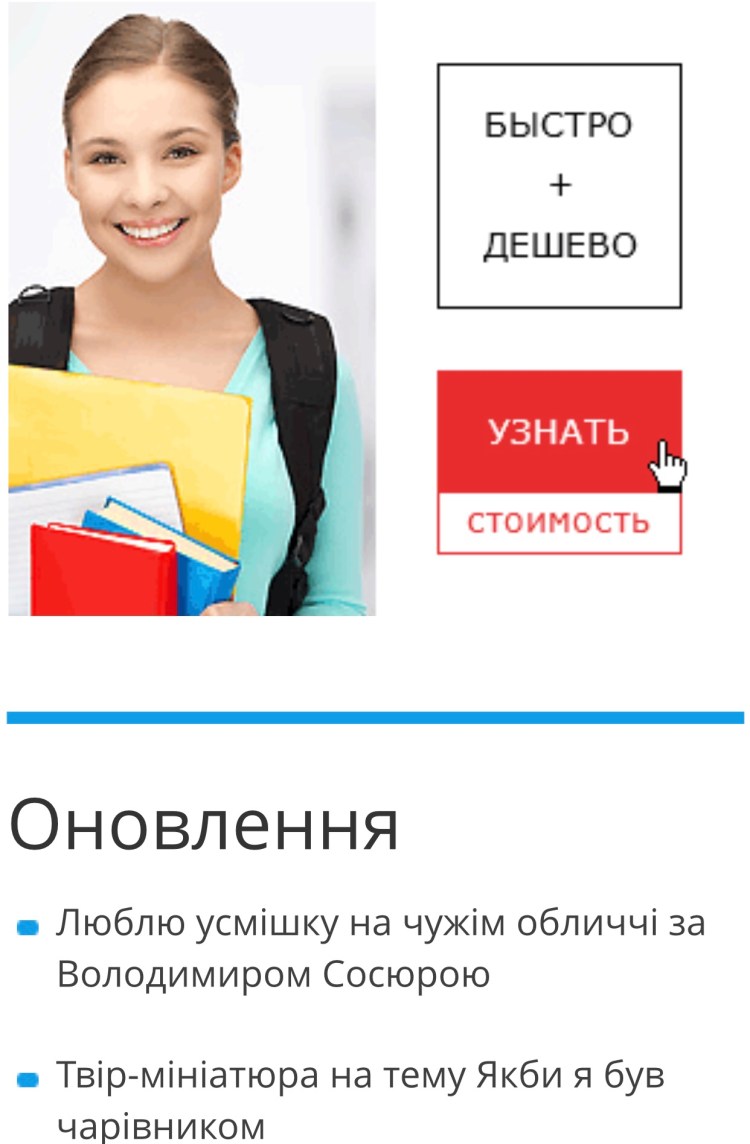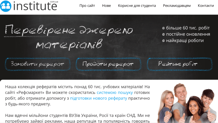 Спочатку ми подумали, що сайт належить якомусь вишу або НДІ. Аж ні, сайт є свого роду біржею, ба навіть ринком чи базаром, на якому можна не тільки купити, а й продати реферат, курсову чи навіть дипломну роботу. Якщо ви не можете знайти вже готового дослідження за темою, яка вас цікавить, можете розмістити замовлення, і за певний час, за певну суму вам таку роботу дістануть “з-під прилавка” або й спеціально напишуть.