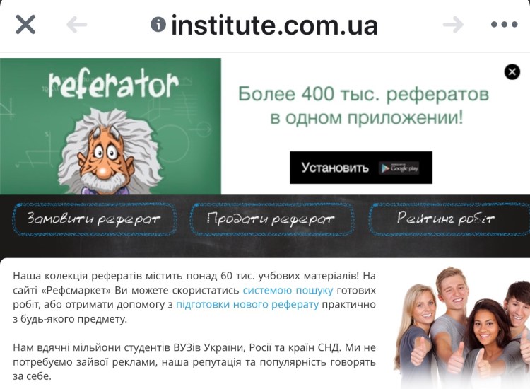 А що пропонує institute.com.us? Уже готові тексти, які допомагають ледачим або заніколеним нестудентськими справами відбути повинність, одержати оцінку й зробити ще один крок до диплома, який хай і не буде фальшивим сам по собі, але фактично не буде підтриманий знаннями.