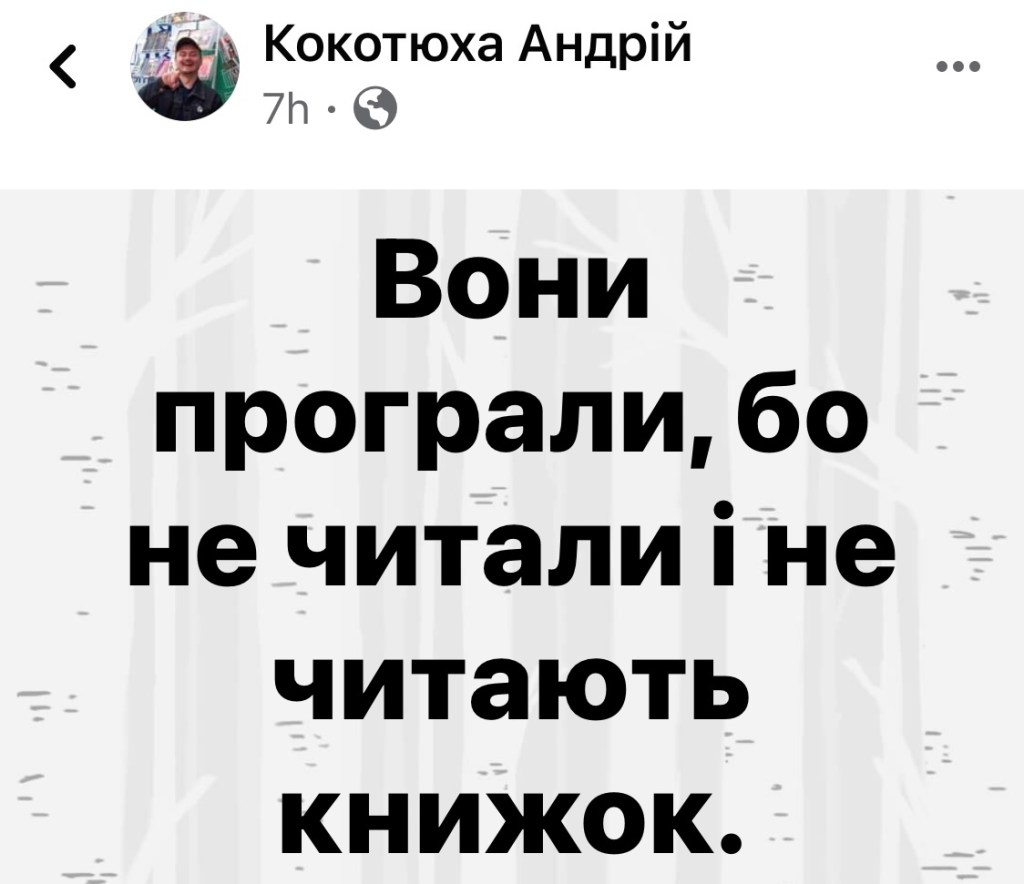 «Вони програли, бо не читали і не читають книжок», — безапеляційно заявив А. Кокотюха.