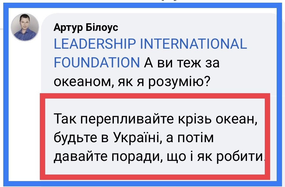 «Не щастить Вам зі мною. Мої комп‘ютери заблоковані — вихід в інтернет неможливий. Нас серйозно взяли в облогу… Неважко здогадатися — хто. Тому перепрошувати не маю підстав, але все одно прошу вибачення. За «тєх парнєй». Можу працювати лише з телефону, і то далеко за межами постійної дислокації. Отже, усе, що можу зараз зробити, — переслати Вам рецензію з електронної адреси UkrainianUniversity@gmail.com».