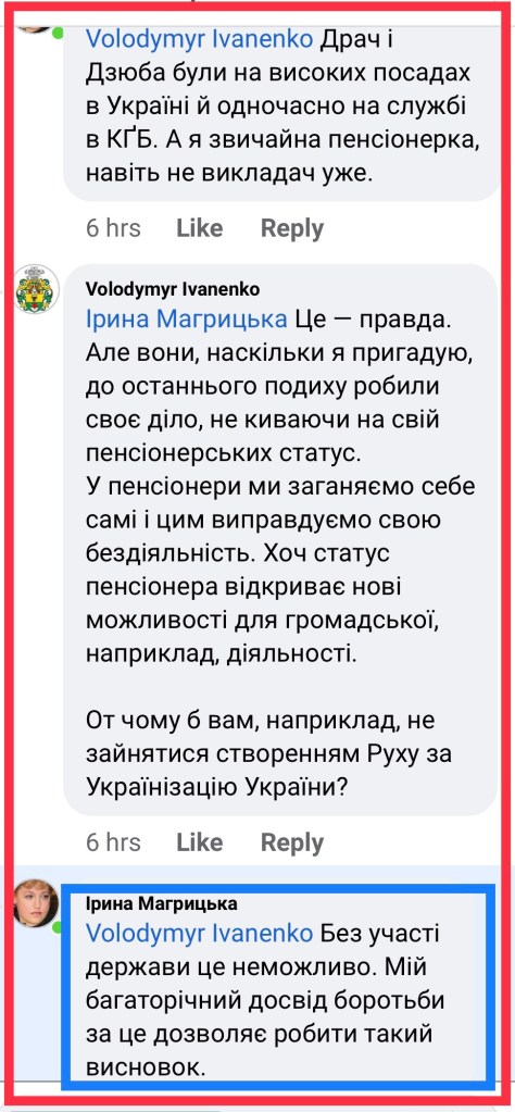 І тут пані Магрицьку понесло: «Драч і Дзюба були на високих посадах в Україні й одночасно на службі в КҐБ. А я звичайна пенсіонерка, навіть не викладач уже».