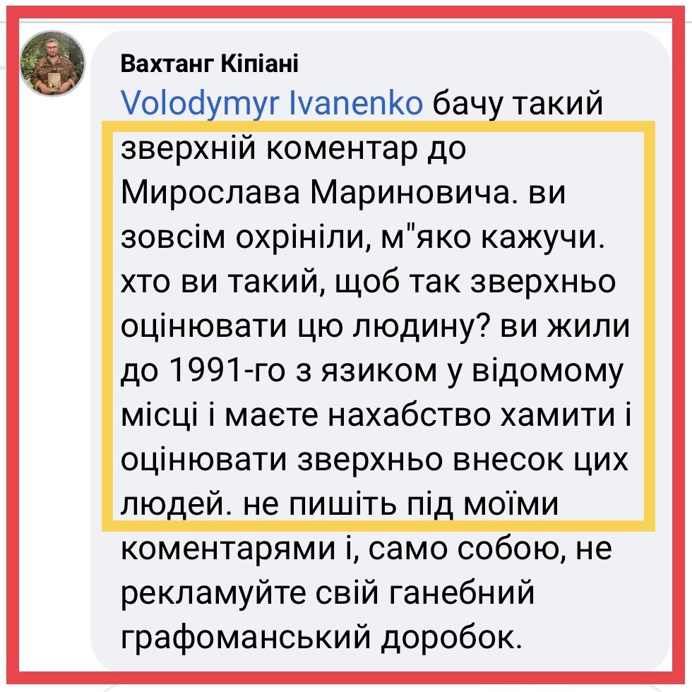 Захищаючи М. Мариновича, Кіпіані тепер уже Мариновича робить недоторканим. «…Ви охрініли, м‘яко кажучи, — пише мені Кіпіані: — хто ви такий, щоб так зверхньо оцінювати цю людину?»