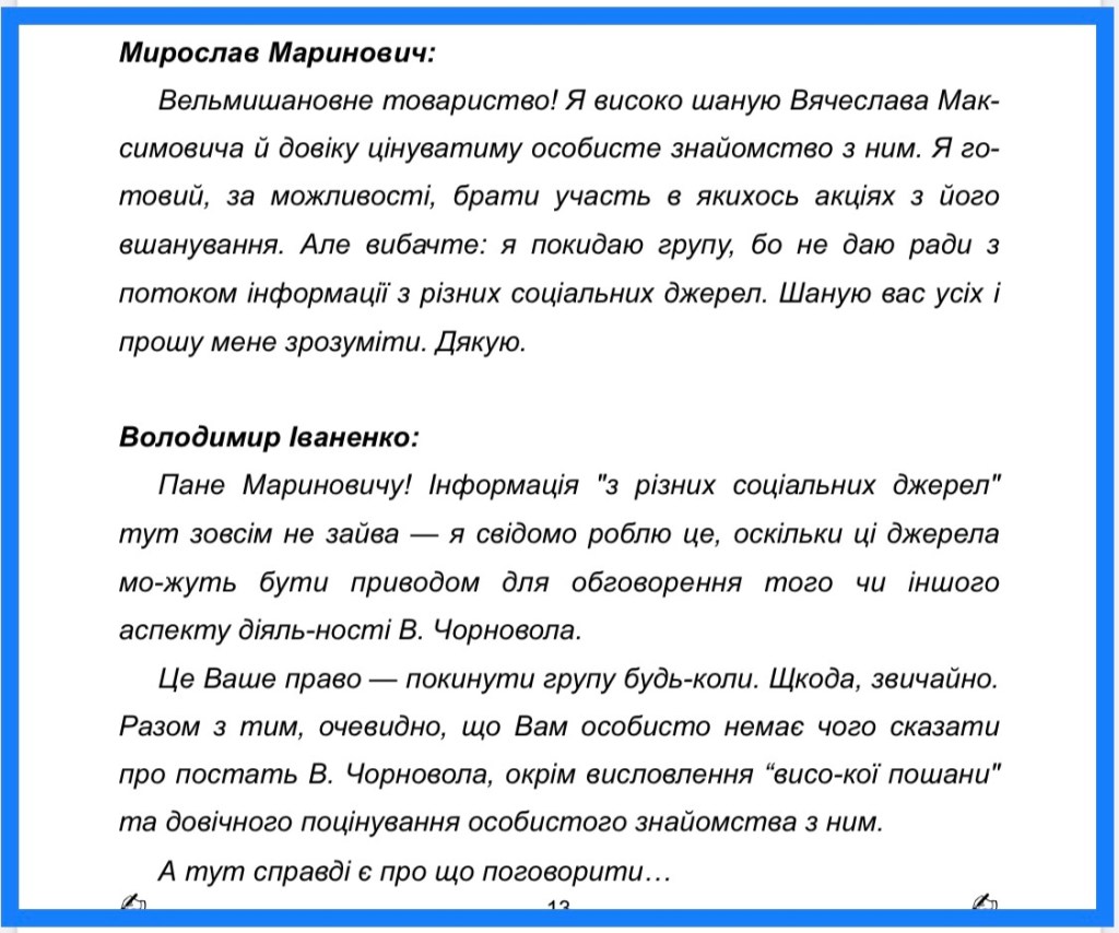 Як модератор дискусії, як бачите, я пошкодував, що пан Маринович залишає групу, і це було його право — залишити її. Ні до того, ні після того я взагалі ніколи не вдавався до оцінювання зробленого Мариновичем, а тим більше до оцінювання його як людини. Була у мене спроба встановити з ним контакт, але Маринович проіґнорував моє повідомлення. Ну, ні, то й ні… Це не змінило мого нейтрального ставлення до Мариновича.