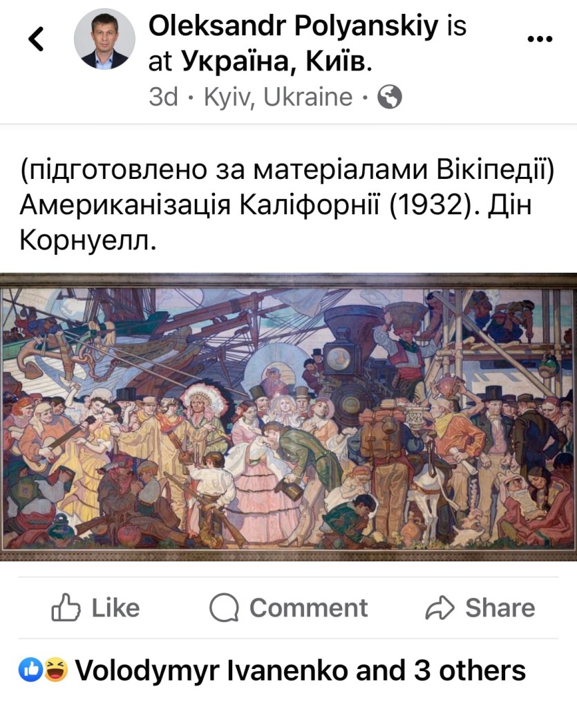 Останній запис Полянського, який зʼявився у моїй стрічці, був присвячений тому, як «збудувати нову Державу» та… «американській мрії». Я розреготався відповідним смайликом (він зберігся під постом Олександра — див. скрін) і написав у коментарях щось на кштплт «О, та ви просто списуєте з Вікіпедії». Цей мій комент, звісно, не зберігся, оскільки пійманий за руку Полянський тут же заблокувався від мене.