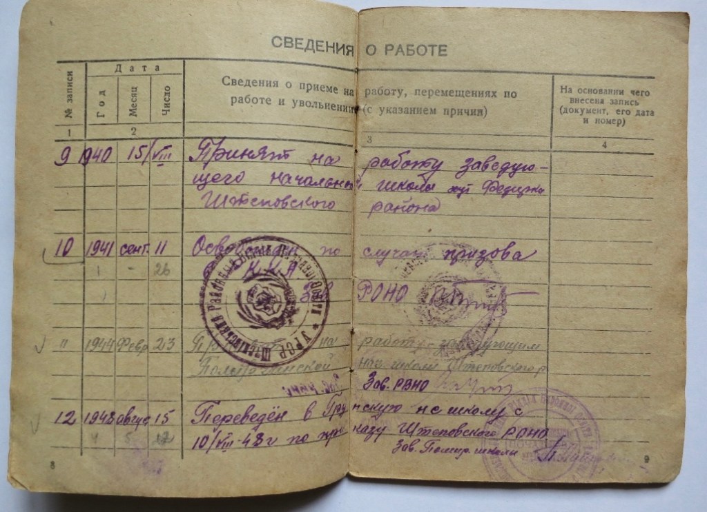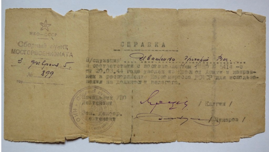 В/служащий Иваненко Григорий Васильевич в соответствии с постановлением ГОКО №5414-с от 20.03.44 года уволен из Красной Армии и направлен в распоряжение Наркомпроса РСФСР для использования на должности педагога.