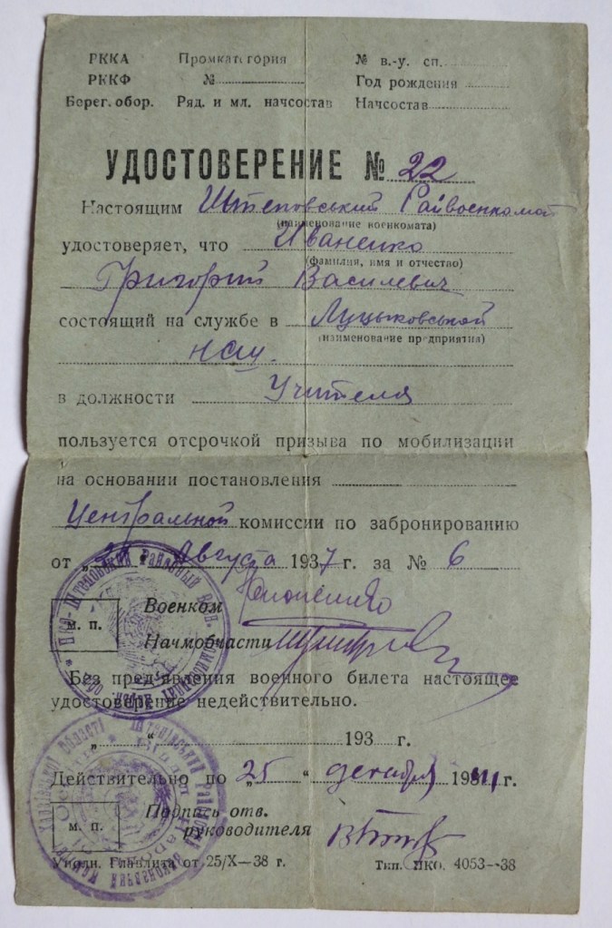 Настоящим Штеповский Райвоенкомат удостоверяет, что Иваненко Григорий Васильевич, состоящий на службе в Луциковской НСШ в должности учителя, пользуется отсрочкой призыва по мобилизации на основании постановления Центральной комиссии по забронированию от 2 августа 1937 г. за №6.