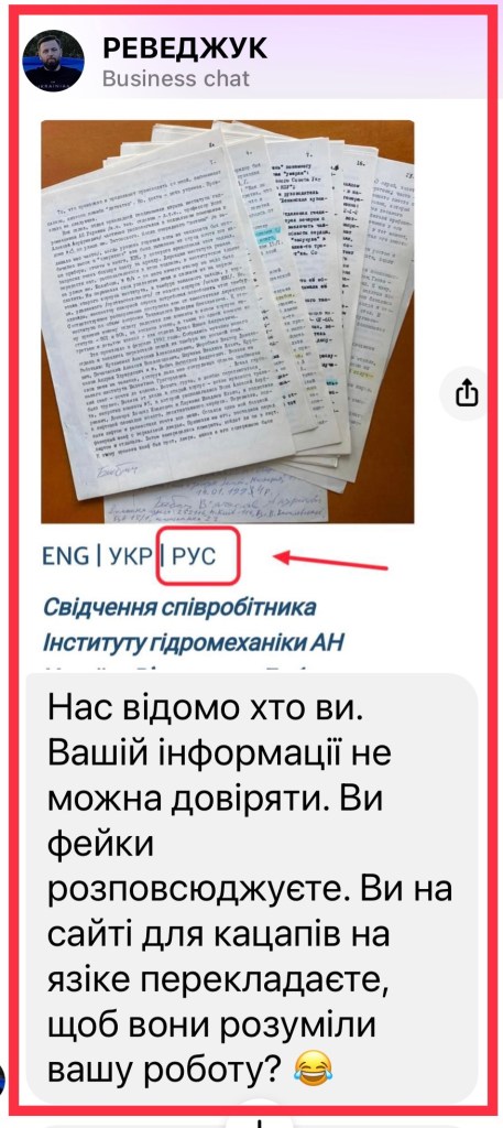 Реведжука і реведжуківців не зацікавила тема публікації й сам документ, але роздратувала вказівка про наявність у публікації російської мови. І ось що вони надіслали мені на приватну скриньку: