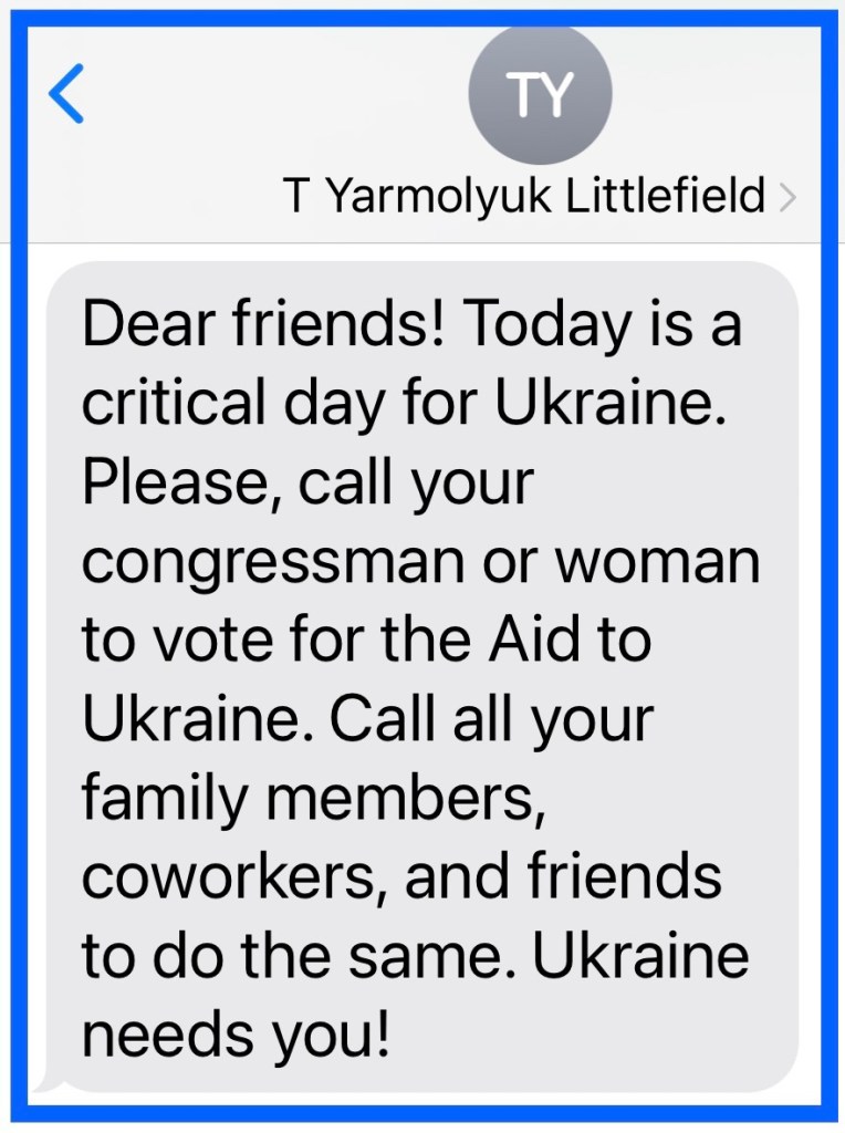 «Дорогі друзі! Сьогодні критичний день для України. Будь ласка, зателефонуйте своєму конґресмену чи конґресвумен проголосувати за допомогу Україні. Попросіть усіх членів вашої родини, колеґ і друзів зробити те саме. Ви потрібні Україні!»
