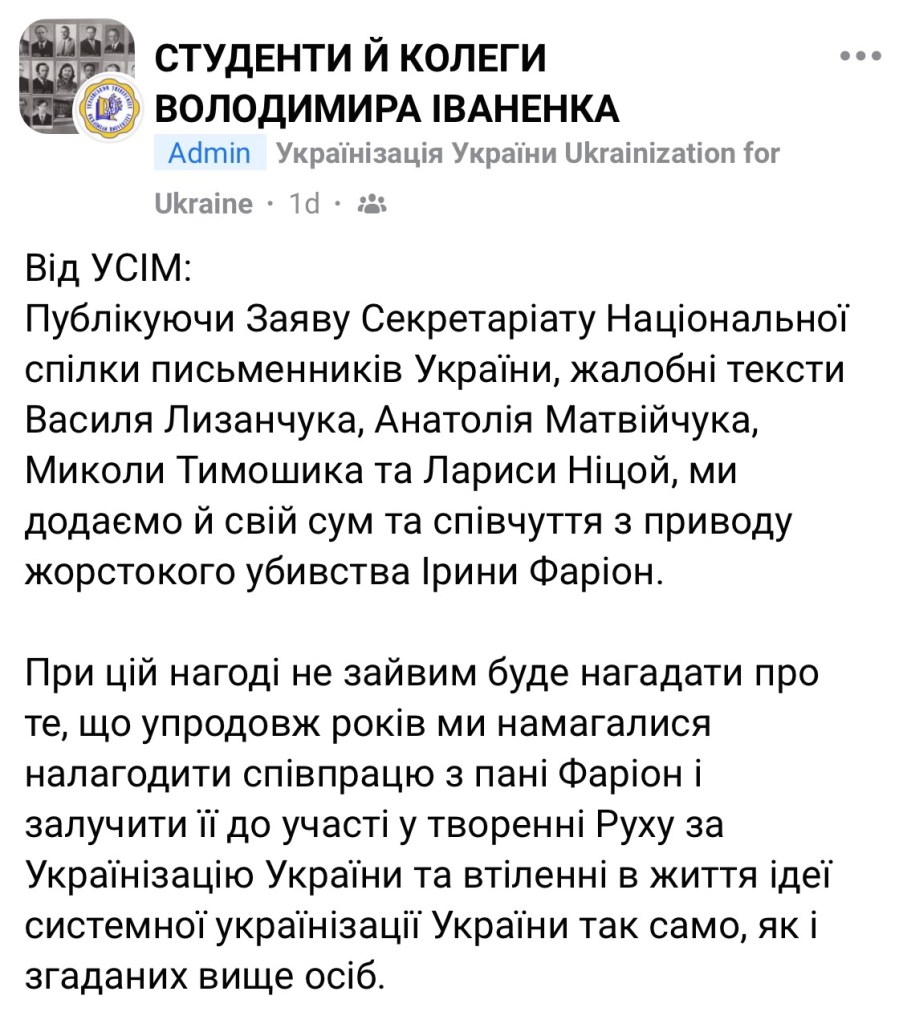 Публікуючи Заяву Секретаріату Національної спілки письменників України, жалобні тексти Василя Лизанчука, Анатолія Матвійчука, Миколи Тимошика та Лариси Ніцой, ми додаємо й свій сум та співчуття з приводу жорстокого убивства Ірини Фаріон.