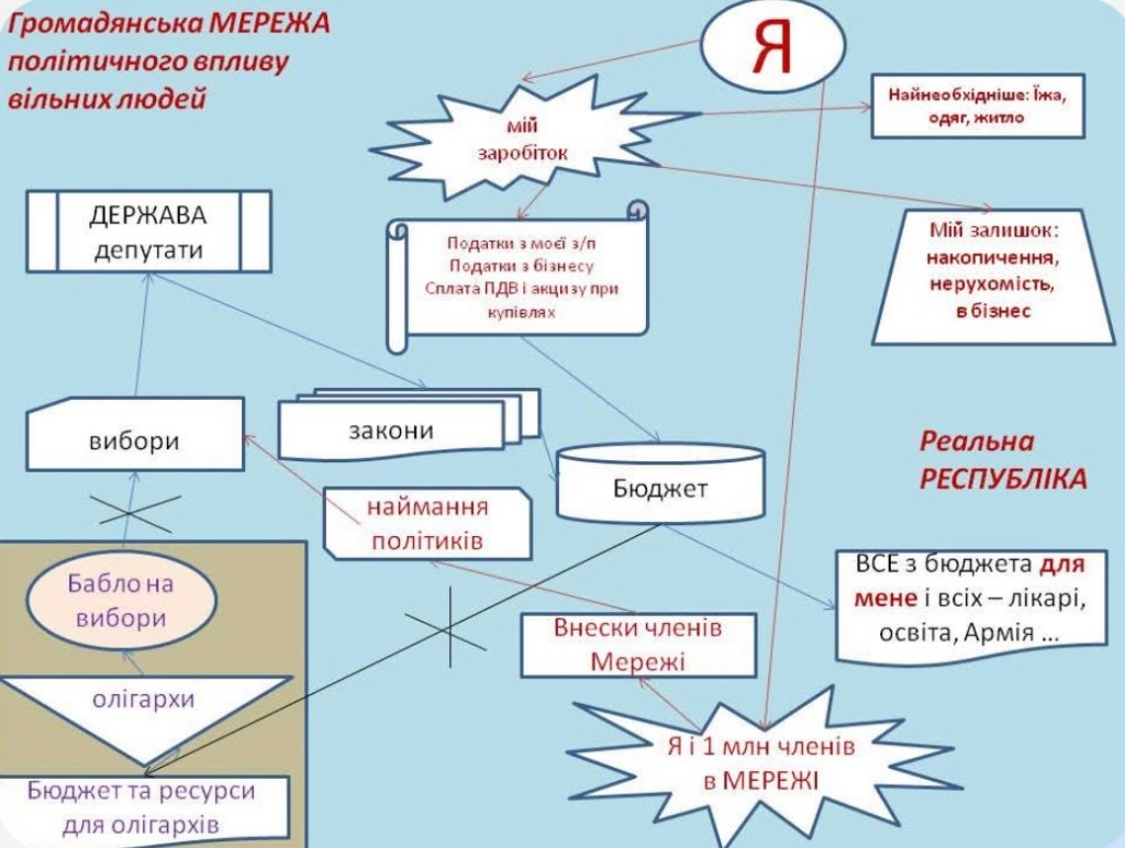 І на даний час є можливість зробити певний крок для цього процесу: стати учасником активного впливу на політичні процеси заради власного розвитку в Україні та для успішності України. Це не заклик від чергового проекту українських політиканів, котрі шукають залучення вашого голосу на майбутні вибори за їхній «політичний проект с ліцом». Поки-що, олігархічні гроші вкладаються у виборчий процес, щоб зберегти для олігархів можливість збагачення за допомогою «слуг» різного калібру. Депутати, обрані за сприяння олігархічних грошей, «віддають» олігархам гроші шляхом забезпечення олігархам доступу до зібраних податків з населення України, загальних ресурсів та майна. Значною мірою замість державницької політики існує «система схемщиків».
