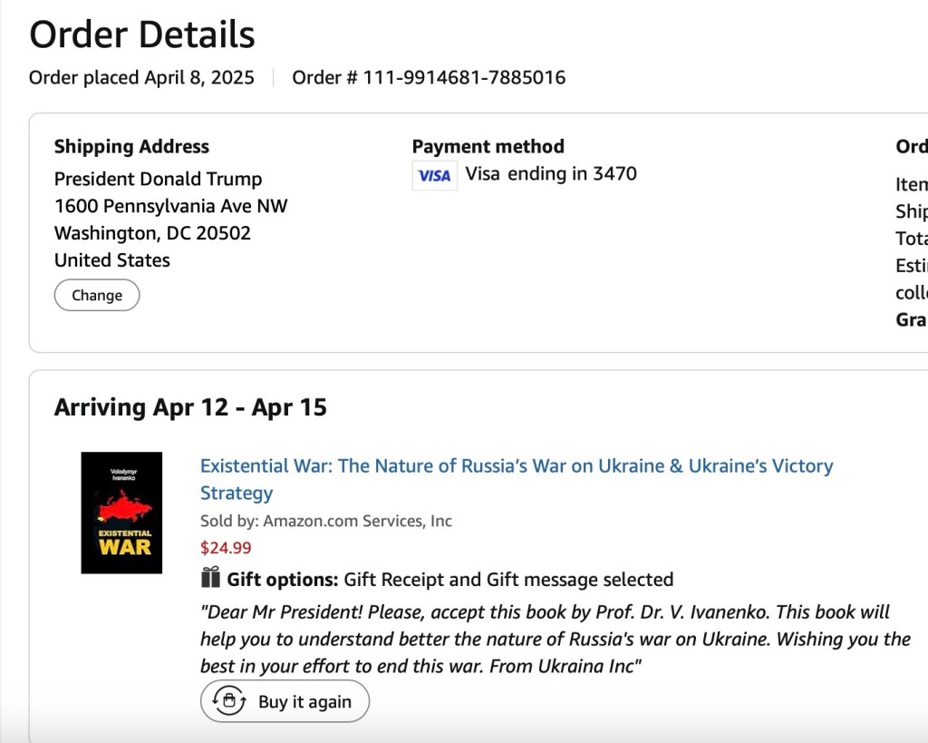 Президентські вибори в США й ідея новообраного президента Дональна Трампа закінчити війну Росії проти України (при цьому аґресором у цій війні Д. Трамп чомусь вважає Україїну) за добу спонукали мене переглянути свої пріоритети, а автомобільна аварія, в яку я потрапив 13 грудня, “створила умови”, щоб я міг зосередитися на підготовці до видання невеликої за обсягом, але насиченої переконливими фактами й арґументами книжки про природу війни Росії в Україні та моє бачення стратеґії перемоги України у цій війні під назвою “Екзистенційна війна”, яку з мінімальним втручанням у мій текст оперативно випустило у світ чикаґське видавництво Hemingway Publishers.